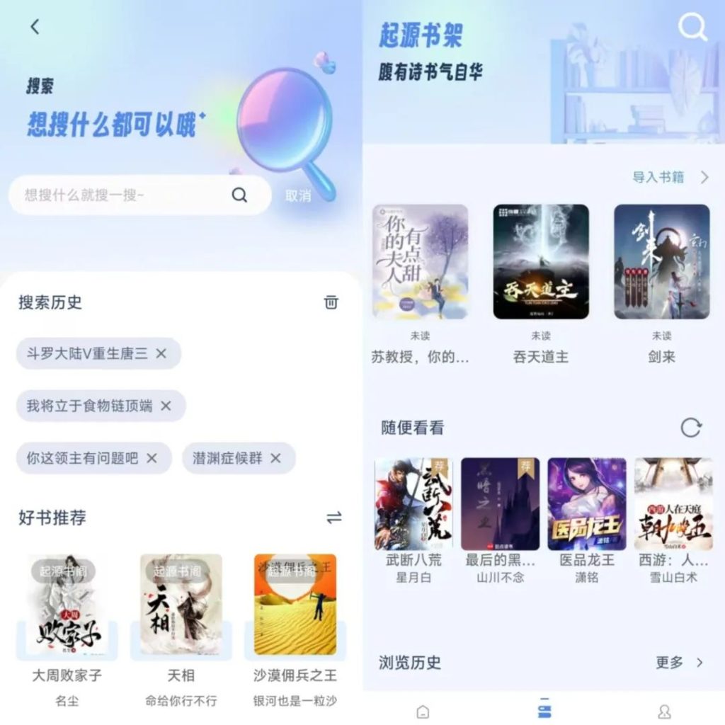 在这里,你可以搜索你想要阅读的任何小说,什么都可以,而且,起源书阁还会通过分析用户的阅读历史、偏好设置以及互动反馈,能够智能地筛选出符合用户口味的书籍,从而提供个性化的阅读体验的同时,也能不断探索新的阅读领域。